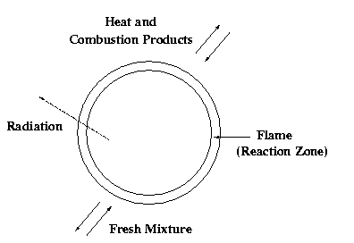 combustion products (outwards) and of fresh mixture (inwards) together with radiative heat loss cause a zero mass-averaged velocity. |